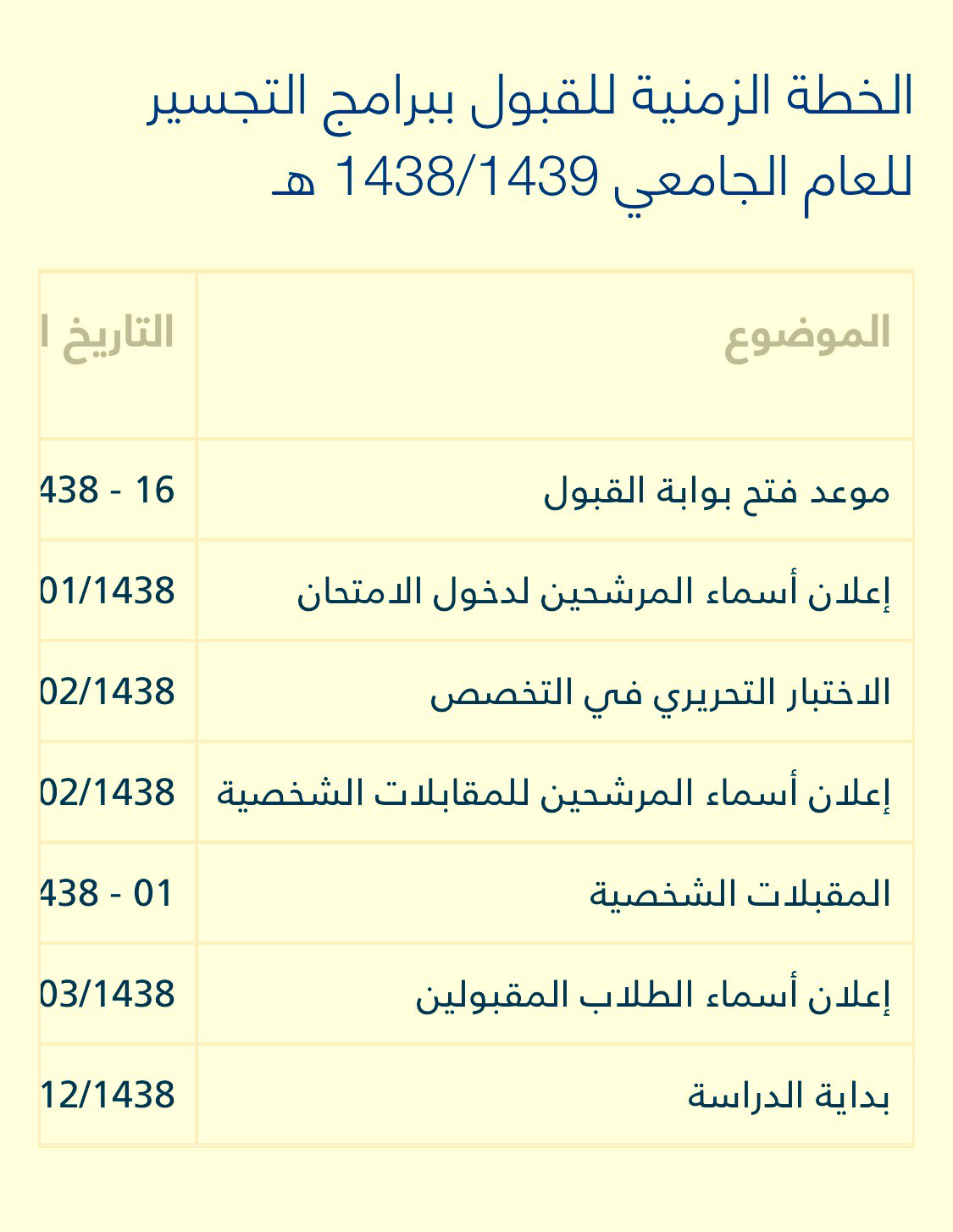 تجسير تمريض 1438 1439. حدث خطأ الرجاء المحاولة مرة أخرى العودة إلى الجدول. أعلنت كلية العلوم الطبية التطبيقية بجامعة الدمام عن فتح باب التسجيل في برنامج التجسير الموازي لتخصص التمريض طلاب طالبات وبرنامج التجسير الموازي لتخصص علوم المختبرات الإكلينيكية طلاب وبرنامج التجسير الموازي. عدم وجود الجامعة يعني أنها غالب ا لم تعلن عن مواعيدها حتى الآن. تعلن عمادة الدراسات العليا عن بدء التقديم على عدد من برامج الدراسات العليا في مرحلة الماجستير والدبلوم العالي في الفصل الدراسي الثاني للعام الجامعي1441هـ اعتبار ا من يوم الأحد 18 4 1441هـ الموافق 15 12 2019م حتى نهاية دوام.